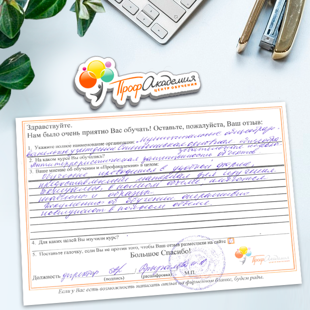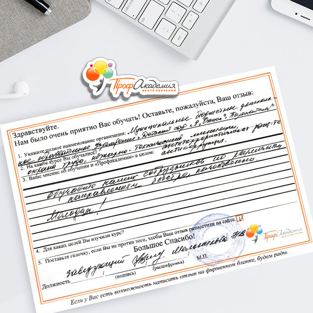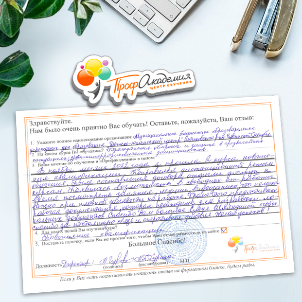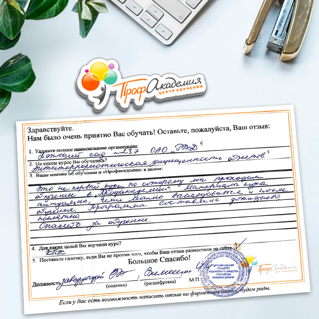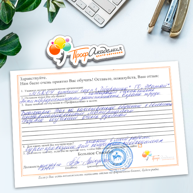 Огромное спасибо за курс обучения по данной тематике. Все было очень понятно, доступно и организованно. Материал предоставлен в доступном объеме, дополнительная была возможность проверить свои знания в решении тестовых заданий. Спасибо куратору Елене за качественное и актуальное обучение.