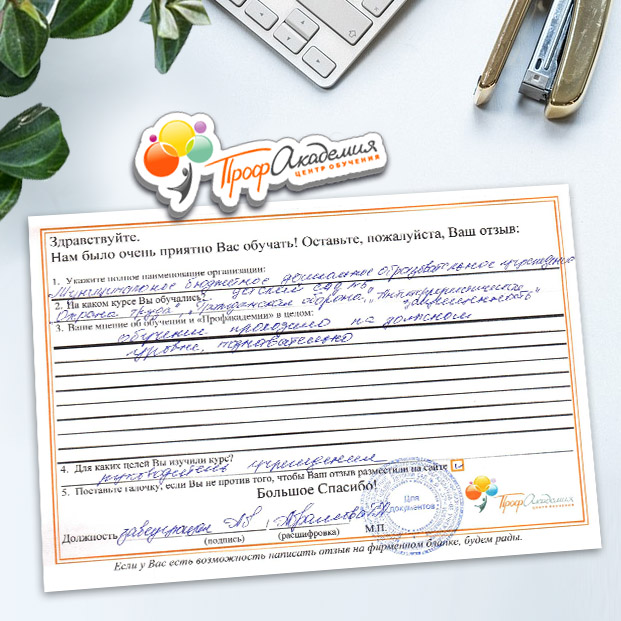 В ноябре месяце 2022 года я прошла 2 курса повышения квалификации. Понравился дистанционный режим обучения. После составления договора открыли доступ к курсам. Появилась возможность в свободное от работы время посмотреть занятия, лекции, видеозаписи, что немаловажно при плотной занятости на работе. Кроме того, предоставлена рабочая документация, которая необходима для разработки локальных документов. Спасибо вам большое. Елене Шляндиной особое спасибо за постоянную связь и оперативные действия. Желаю успехов!