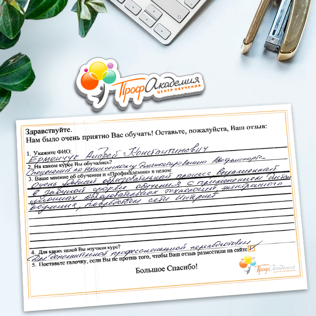 После успешного окончания обучения вы получите документы установленного образца. Высылаем по почте заказным письмом.