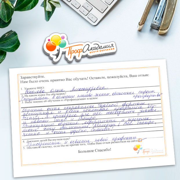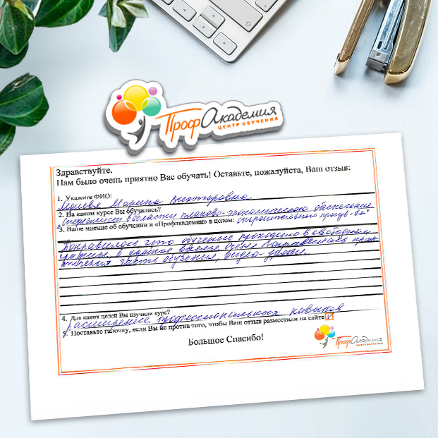 Обучение очень понравилось. Удобный формат, доступная и очень понятная программа обучения. Я приобрела для себя необходимые знания и навыки легко и быстро. Организацию обучения, оформления и пересылок тоже хочу отметить. Молодцы! Все быстро, четко и очень удобно. Спасибо!